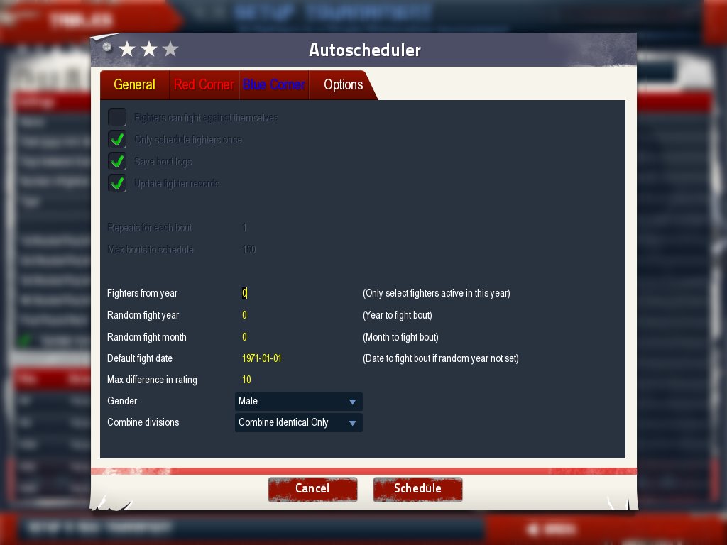 When I try to use the auto scheduler it is not letting me enter the max or min number of fights on the General tab. I cannot schedule multiple fights and it does not seem to accept the criterion for the red corner.